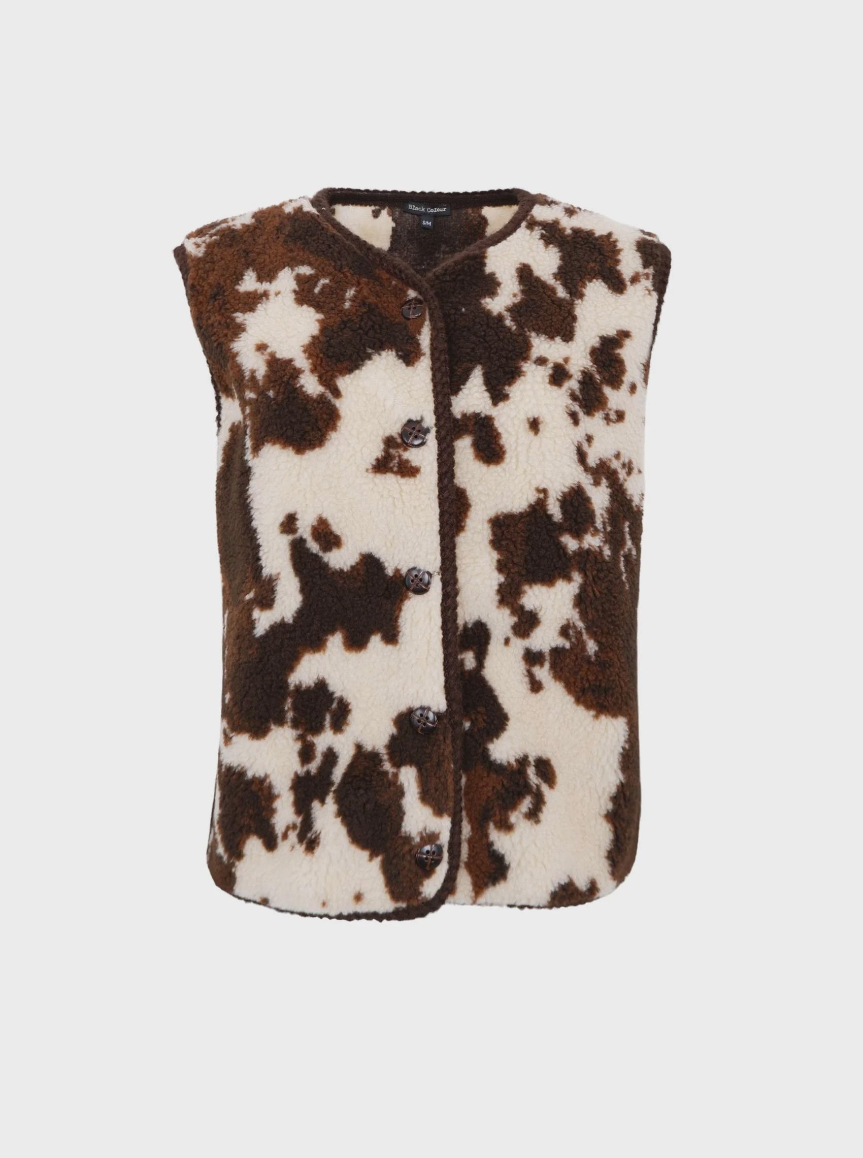Lovely, soft vest in teddy quality that gives a warm and cozy look. The vest has a beautiful, multi-colored pattern and closes at the front with buttons. The model is sleeveless and has a slightly boxy fit, which makes it ideal for layering over knits, shirts and long-sleeved tees. A perfect statement item that also provides extra warmth on cold days.