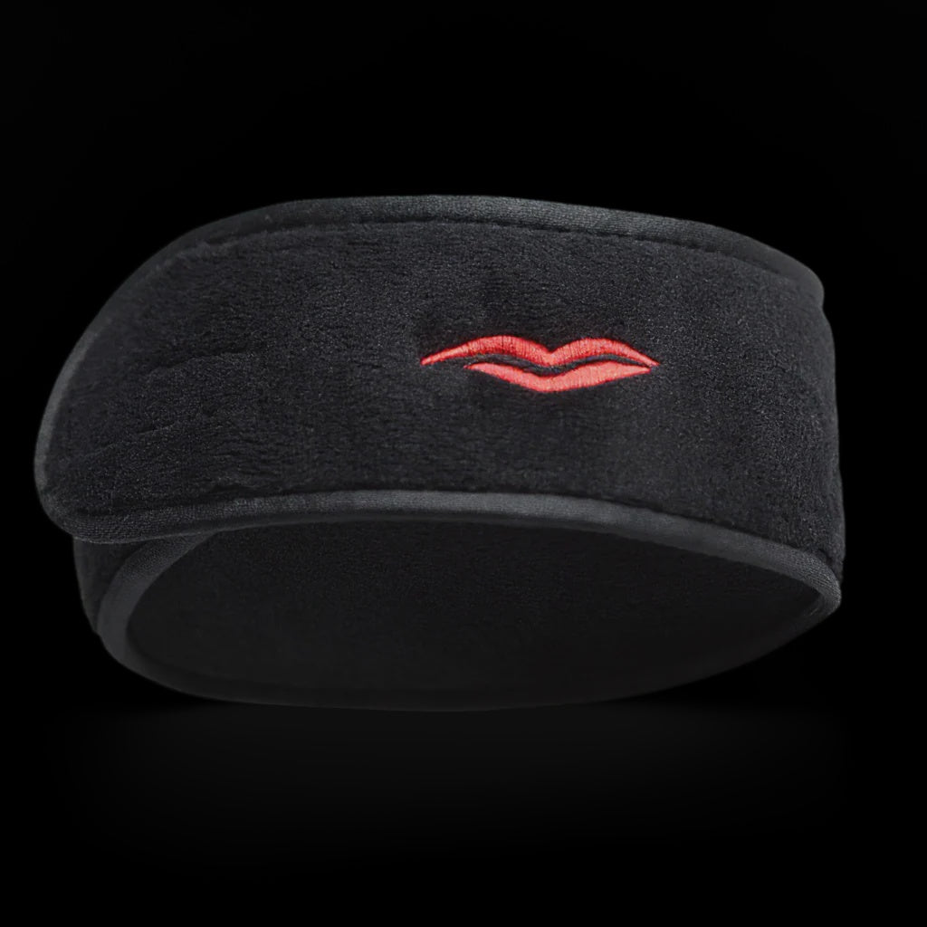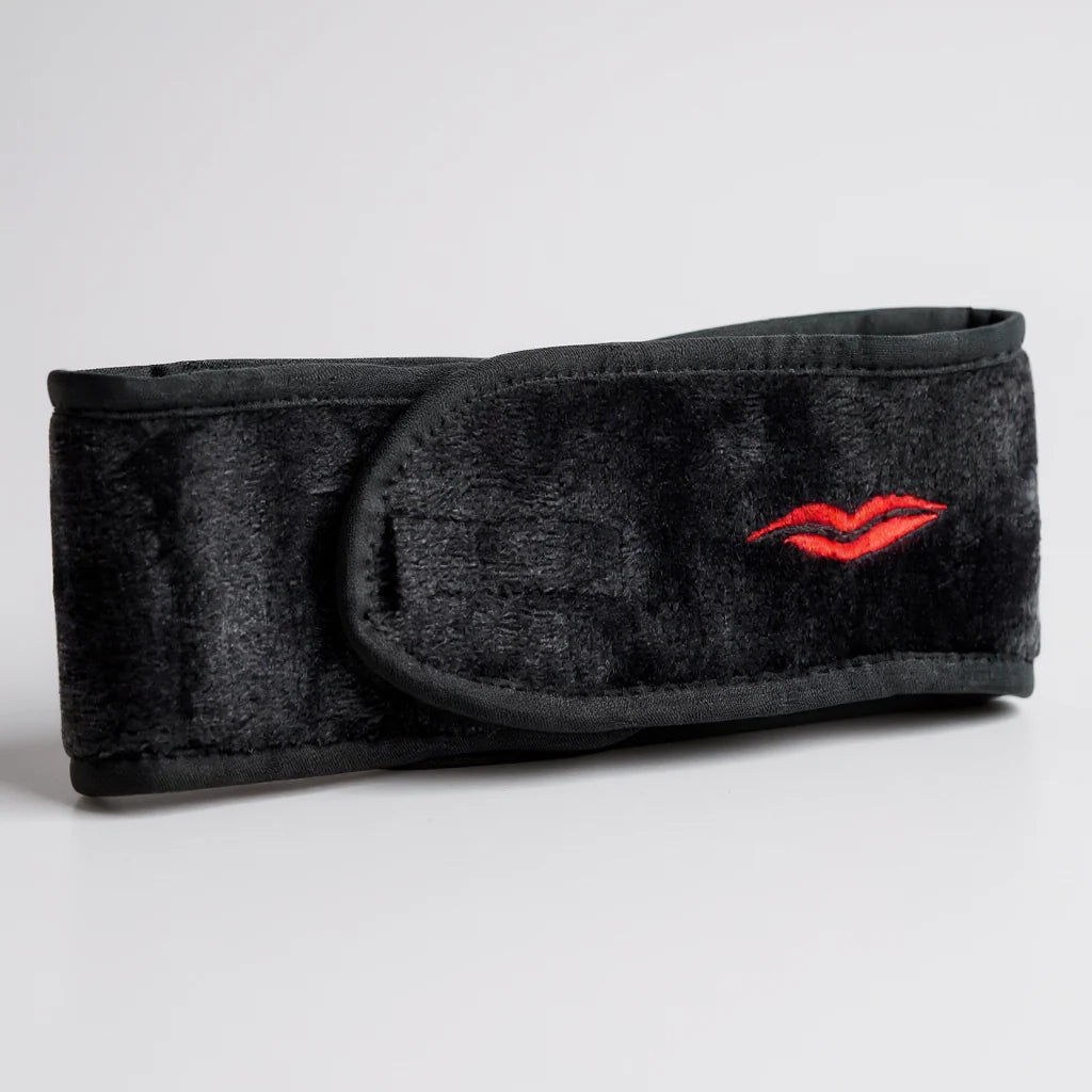 Crafted from super-soft black microfibre, this headband gently keeps your hair back while you cleanse, mask, or apply makeup — no tugging, no slipping, no stress. The adjustable Velcro fastening ensures a comfortable fit for every head size, while our signature embroidered red lip adds that unmistakable DML touch.