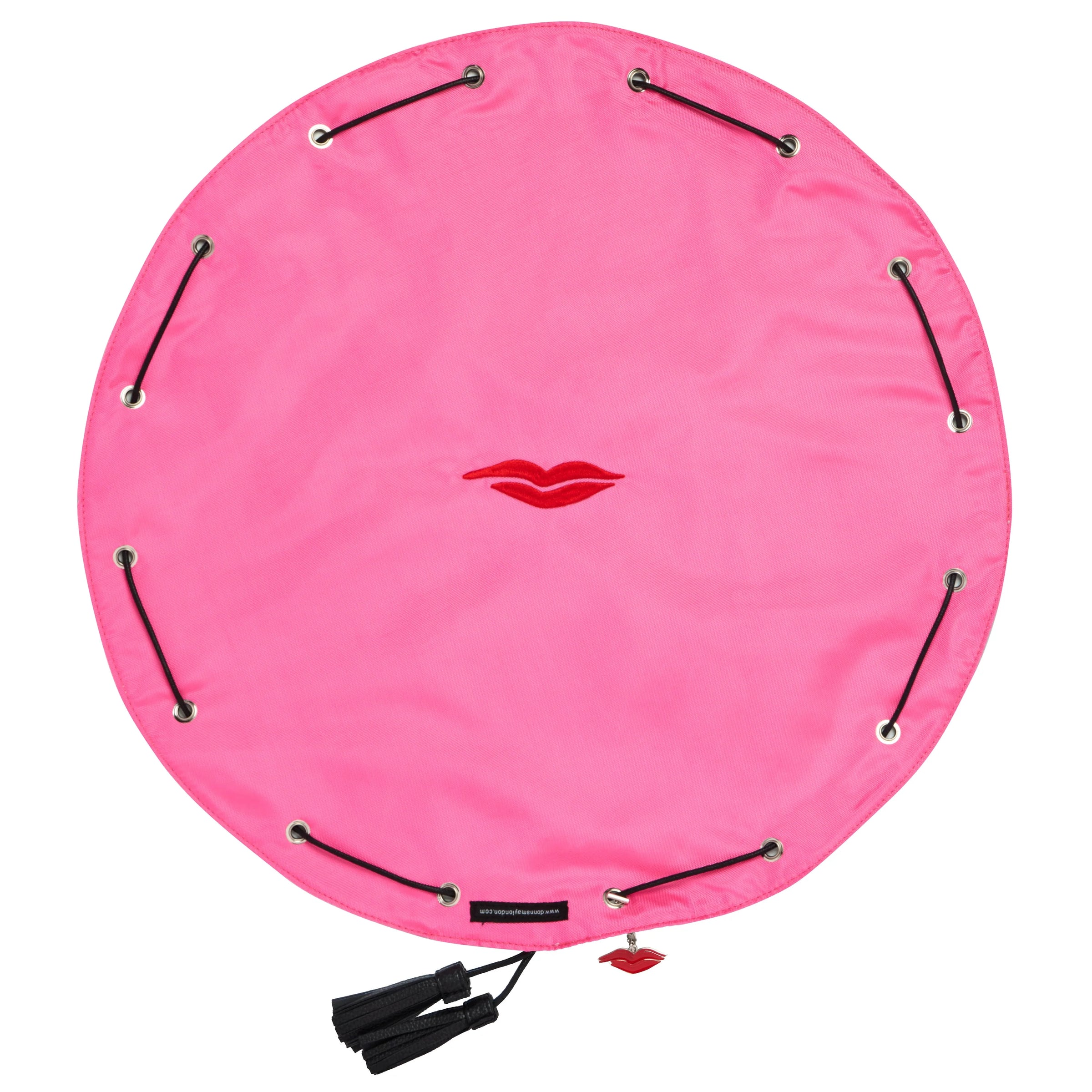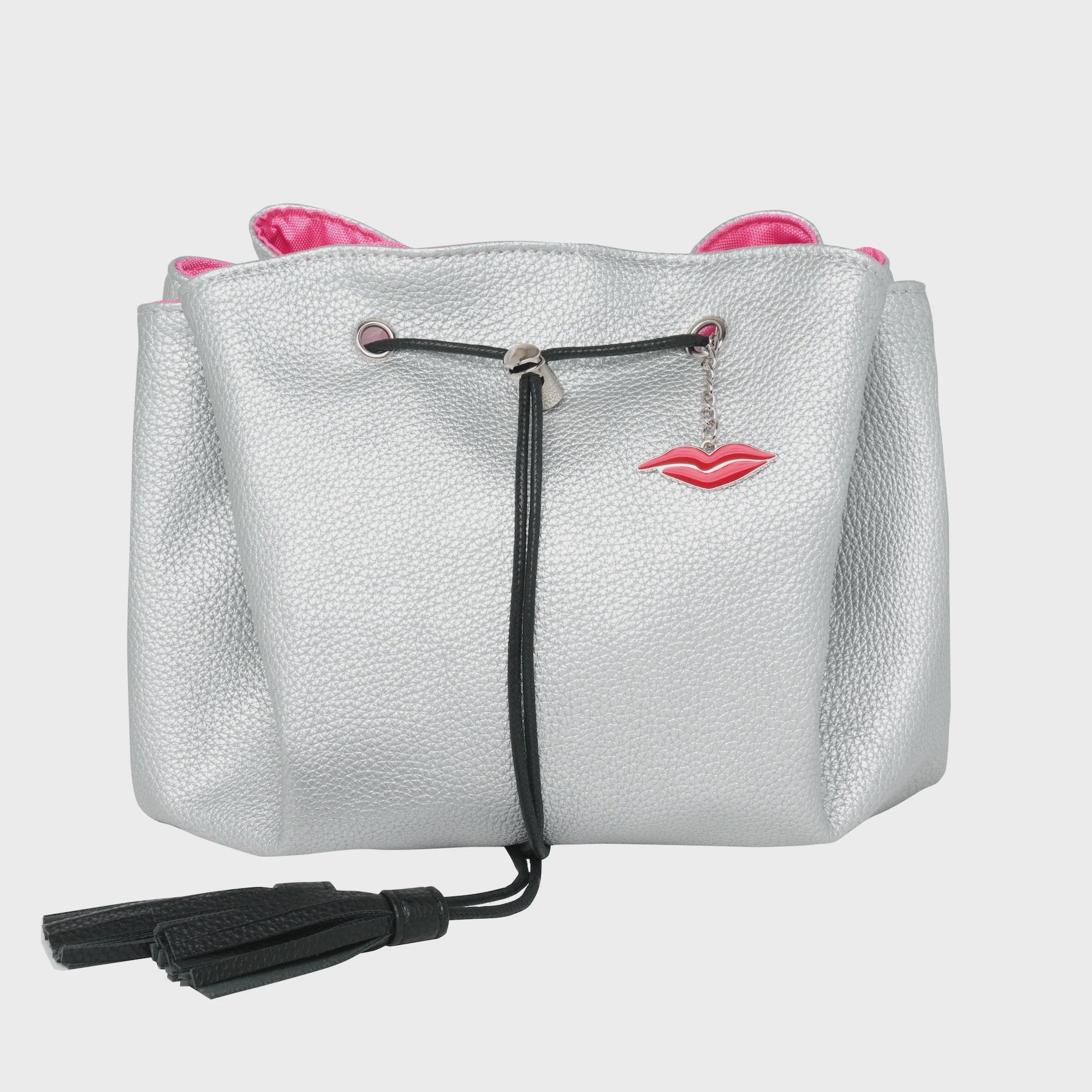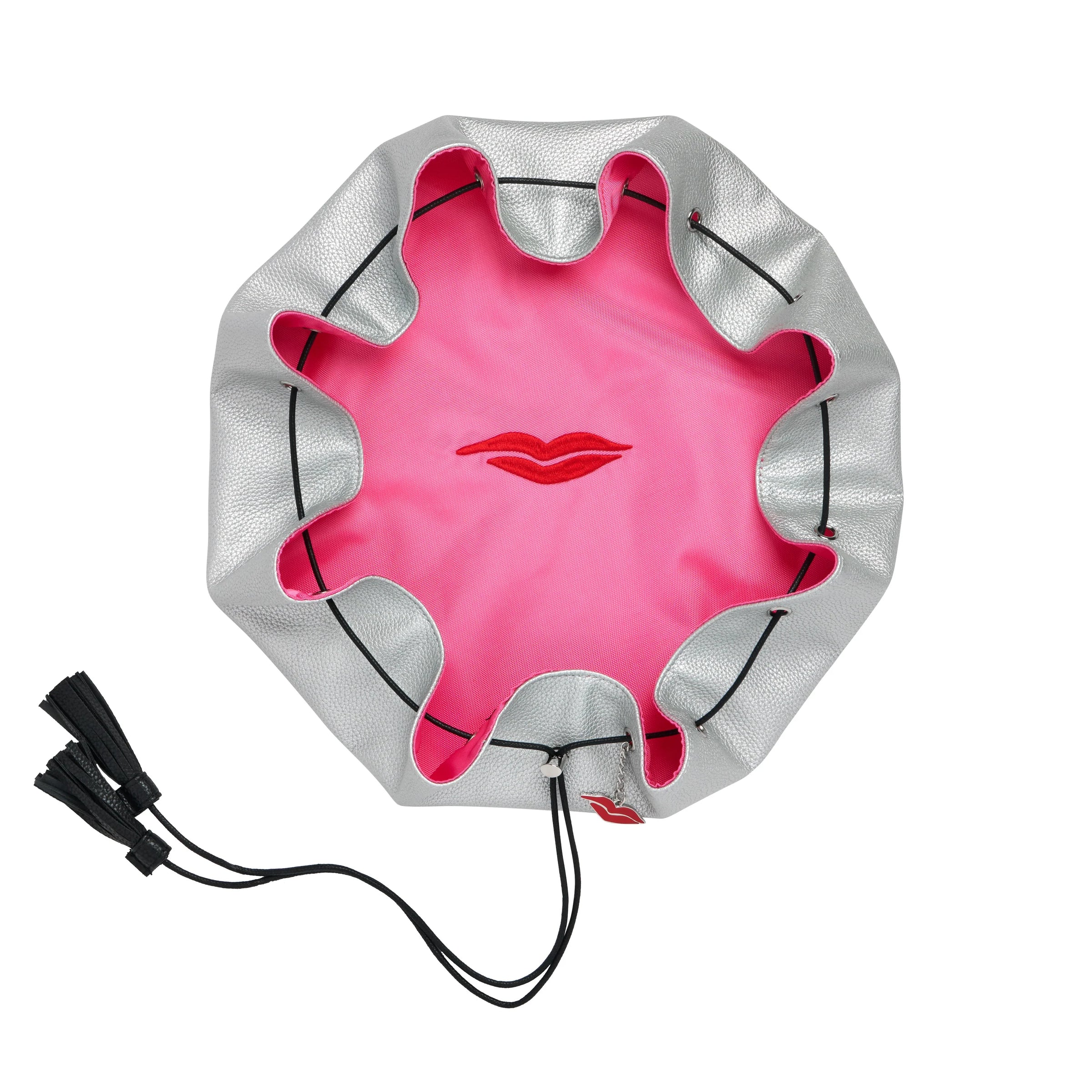 The stunning contrasting pink interior makes a wonderful statement and pairs perfectly with the iconic red-lip embroidery.