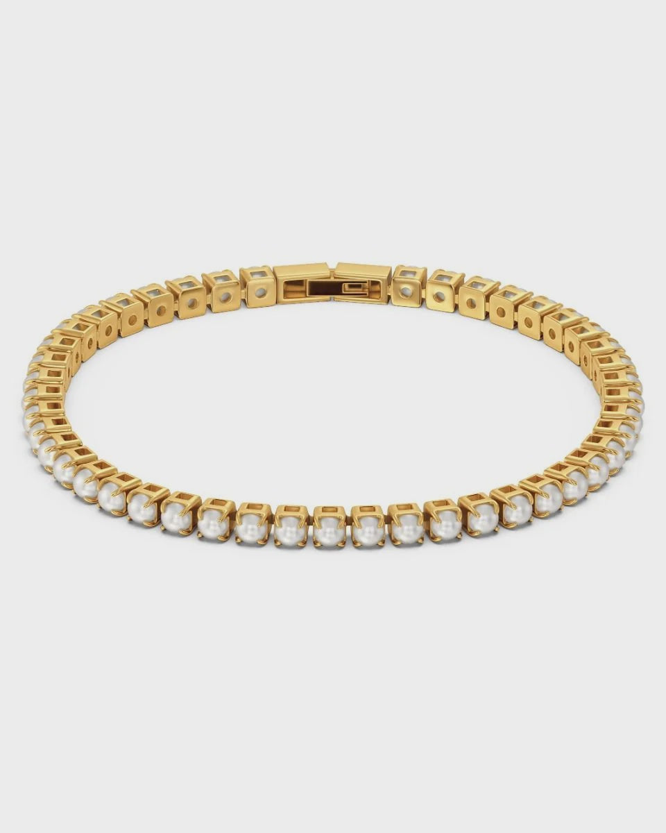 A rhythmic pattern of mini pearls forms the basis for this romantic and versatile series that is ideal for both parties and everyday wear. The multi-bracelet, seen here in 14K gold plating, evokes a tennis bracelet with steel beads instead of stones and sits attractively on the wrist