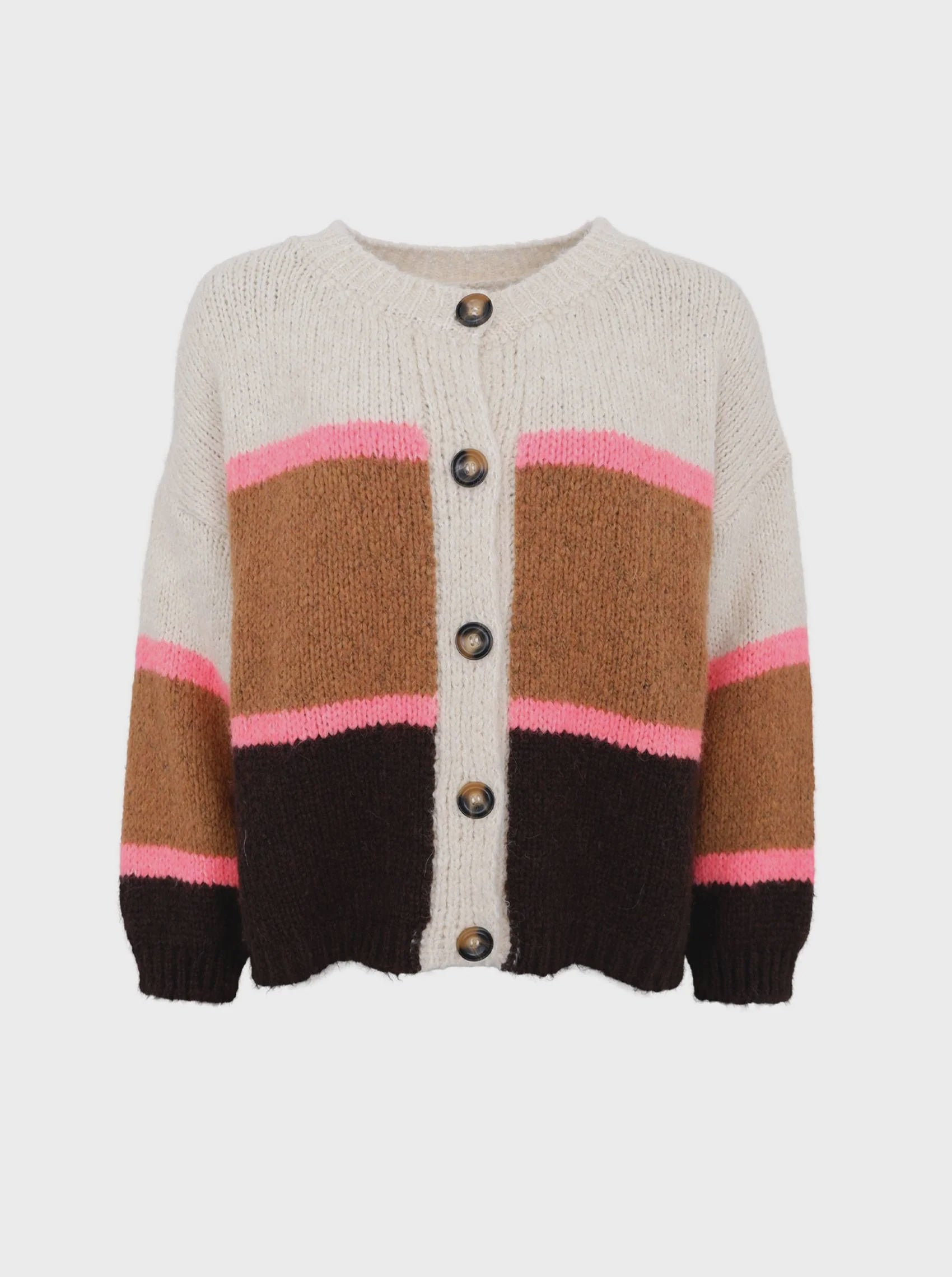 Soft and warm cardigan with contrasting colours, a round neck and button closure at the front. It has a relaxed fit and ribbed edges at both sleeves and bottom for a comfortable and well-fitting look.