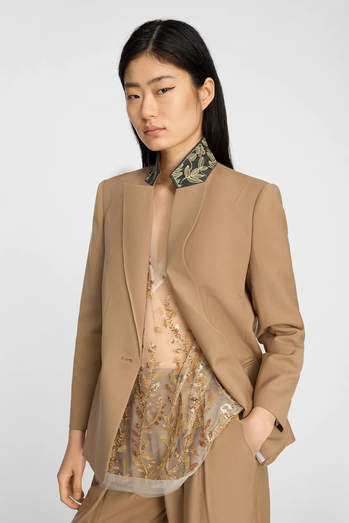 Blazer crafted in a smooth woven quality with a tailored silhouette. Designed with a single-button closure, front pockets, and a contrast collar detail that adds a subtle decorative touch.