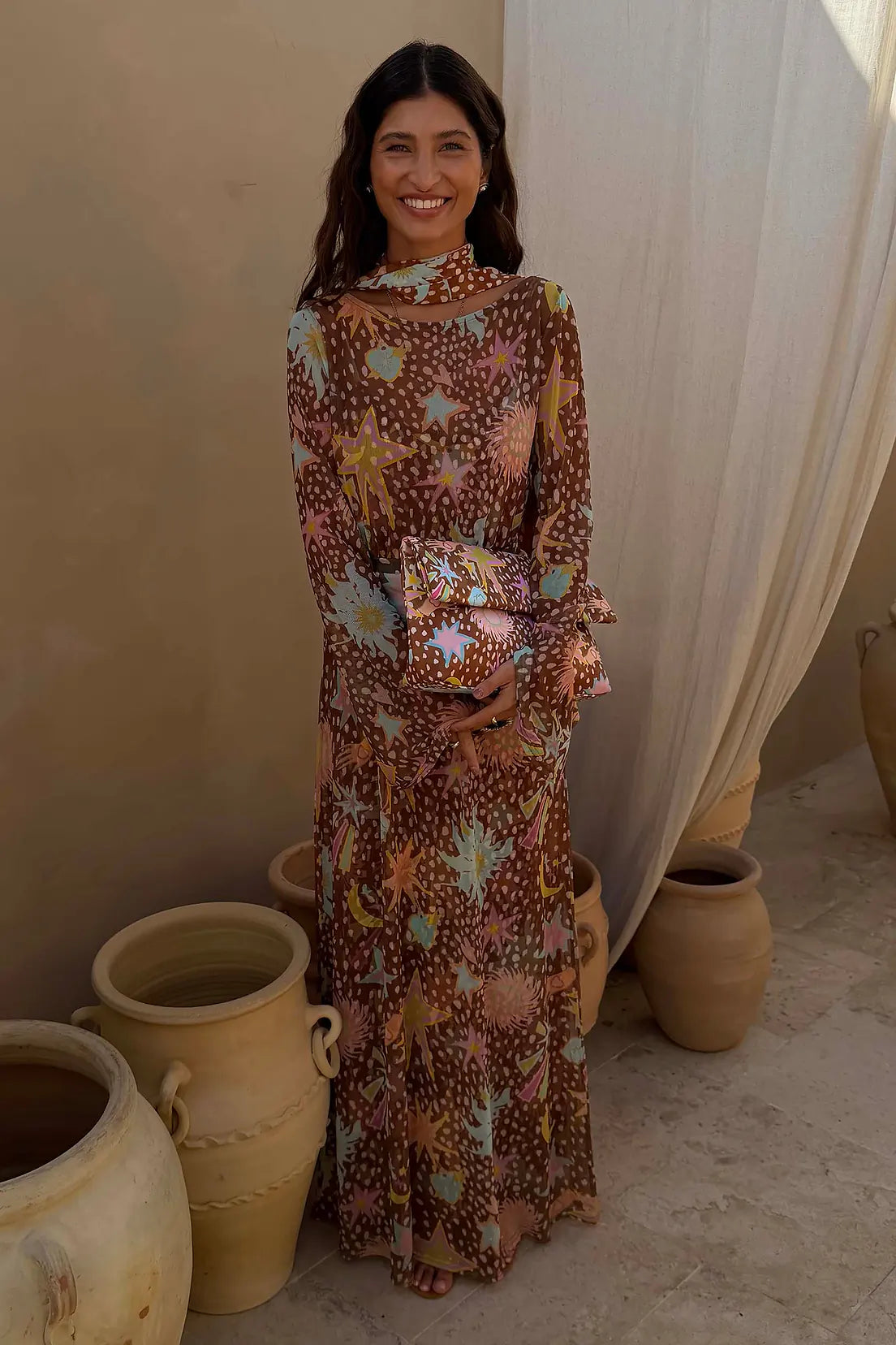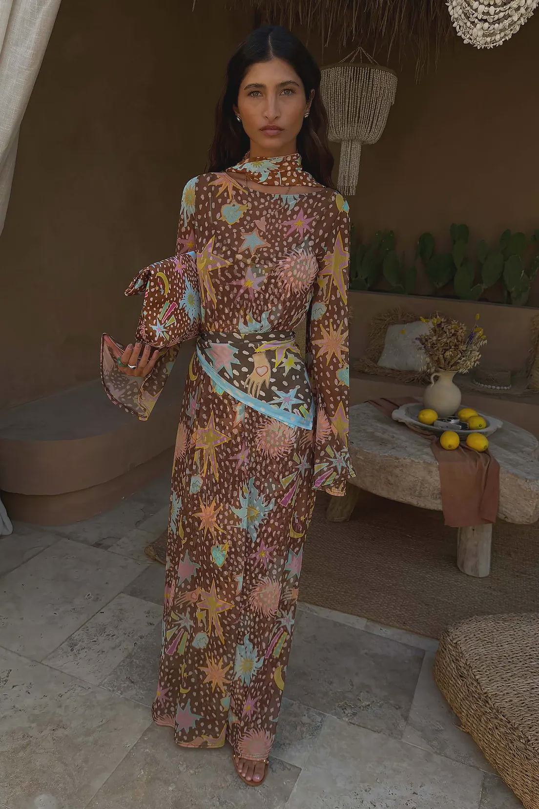 This dress is the definition of feel good dressing! On a subtle brown base, we've paired our fawn spot print with a range of motifs form our new 2026 collections such as our sun, star and palm designs. The simple silhouette with slight flared sleeves paired with the combination of our deer and NFD motifs make it the perfect trans-seasonal dress. Add the slip underneath for extra coverage or for more sexy styling wear over underwear or a swimsuit.