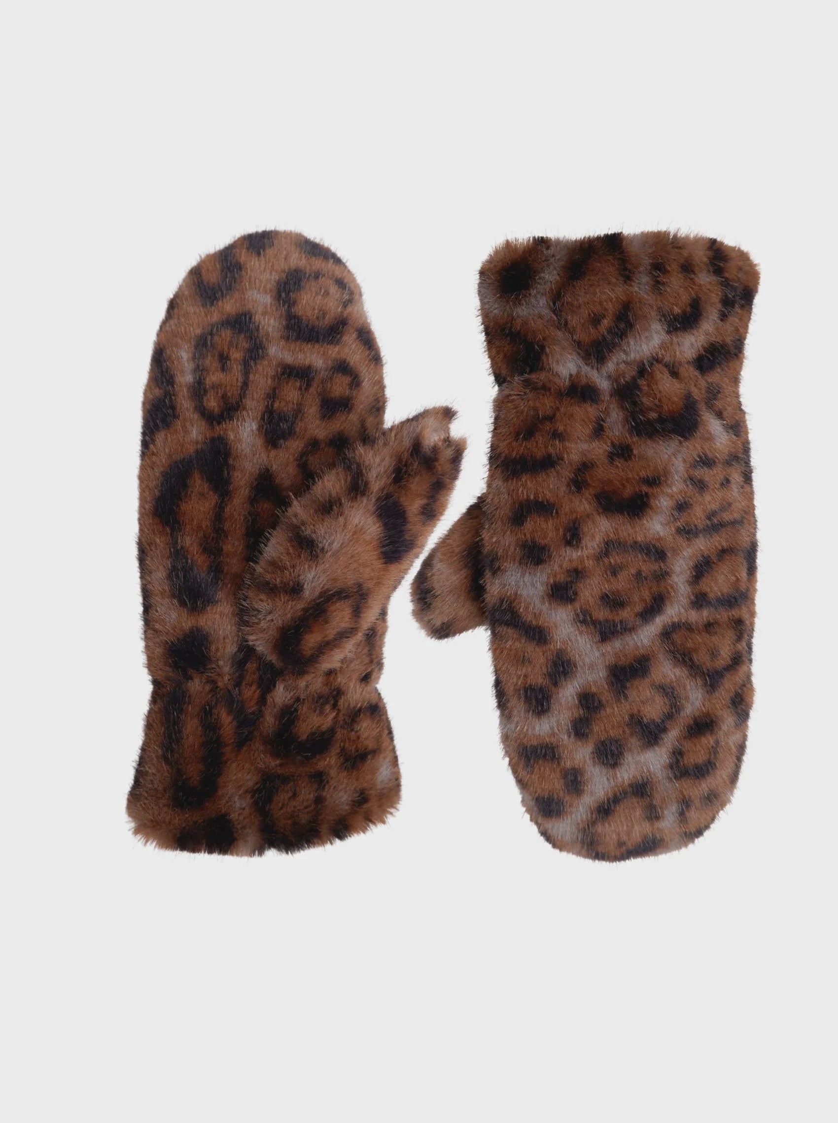 Soft and cozy leopard print mittens in fake fur and with fluffy lining.