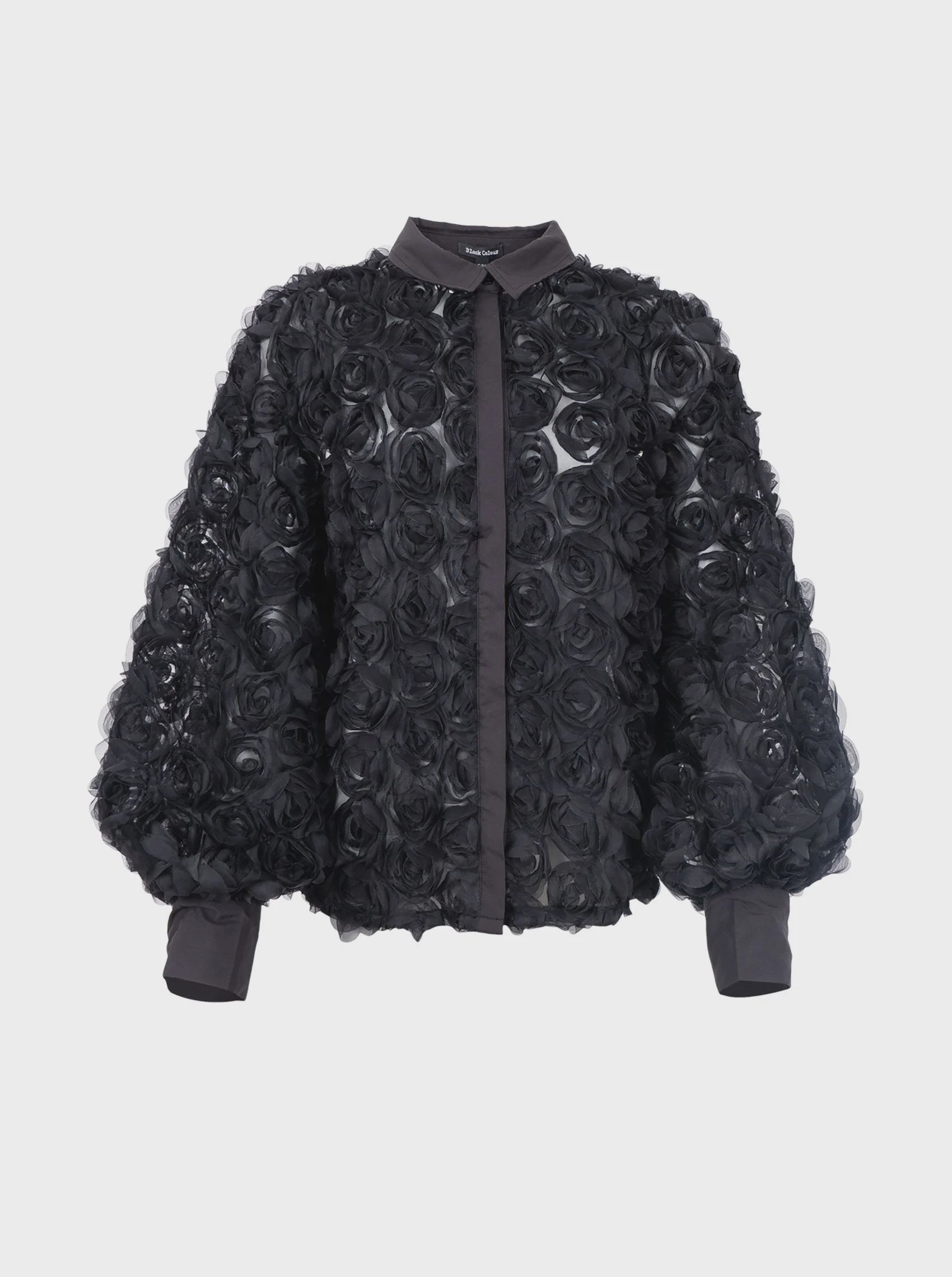 The Chiara shirt is a showstopper with its unique applique floral design that adds structure and exclusivity to any outfit. The slightly transparent quality creates a feminine contrast to the striking details, while the voluminous sleeves and hidden button closure complete the dramatic look.