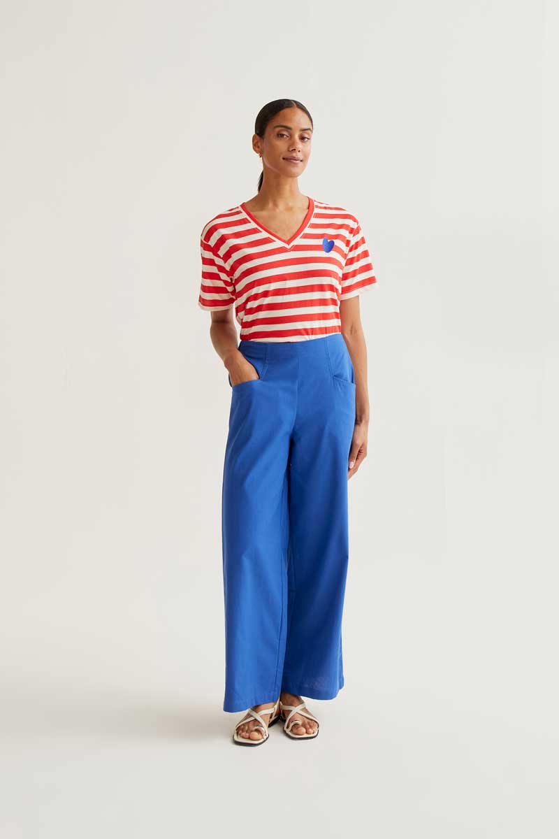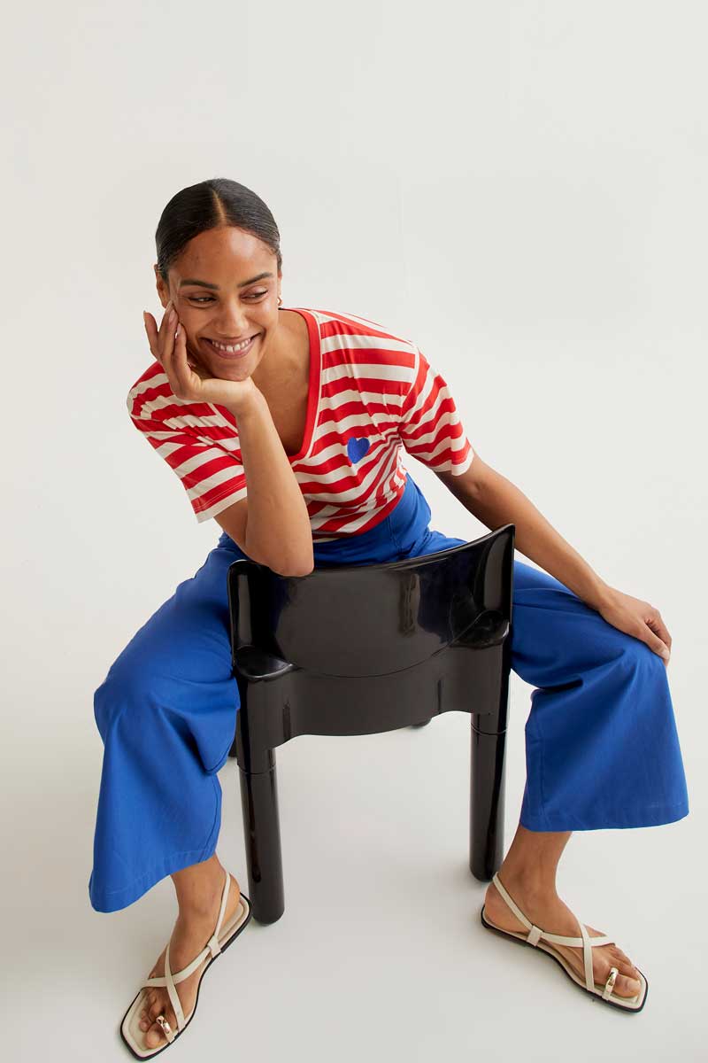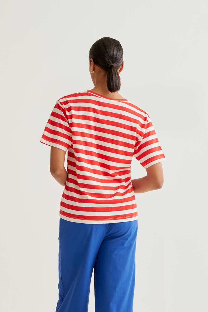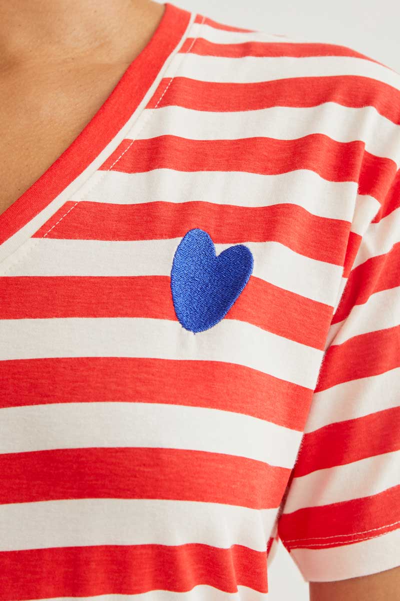 100% cotton T-shirt with a white and red striped print. V-neck and short sleeves. Slightly dropped shoulder. Embroidered blue heart detail. The model is 173 cm tall and wears size S.