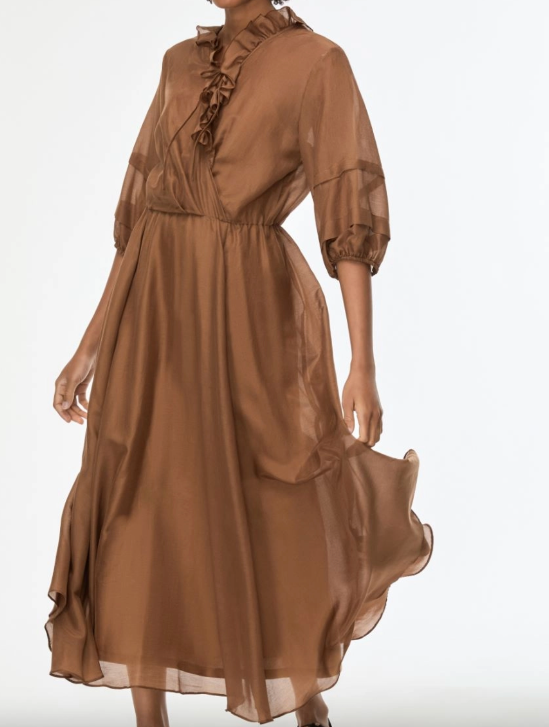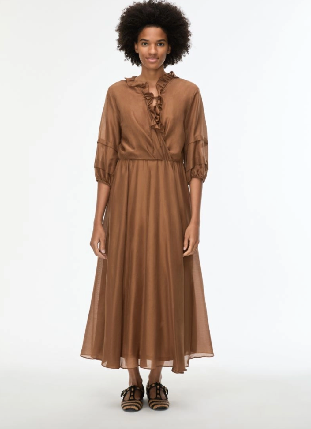 Tie-up ruffled criss-cross V-neckline, and 3/4 sleeves with pleat and elasticated detail at the hem