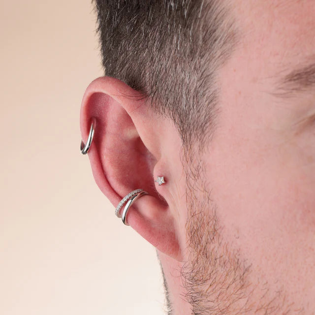 Add this sparkling star flat back labret stud earring to your curated ear for a touch of sparkle and celestial styling. A super comfortable earring design, flat back earrings can we worn all day long or even when sleeping with their smooth flat disc back that provides ultimate comfort. Studded with a clear cubic zirconia stone shaped like a star, this labret stud earring can be worn anywhere on the ear, from cartilage to earlobe and even the nose.