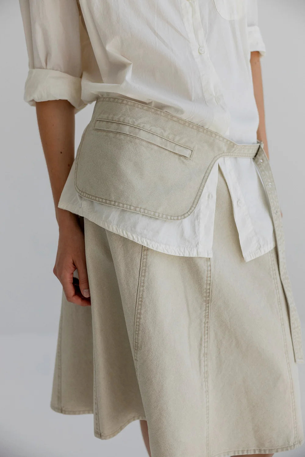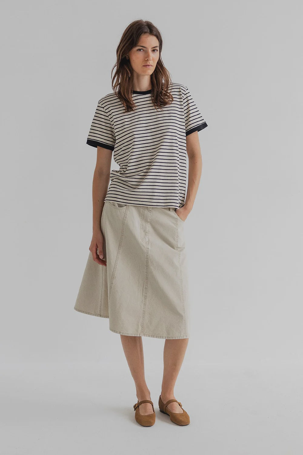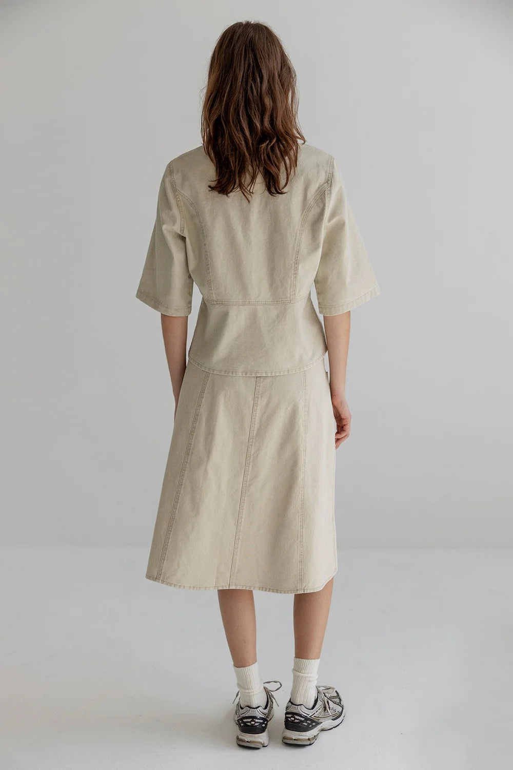BETTY is an A-line skirt in structured cotton canvas. Designed with two front pockets, belt loops, and a classic zip and button closure at the waist. The cotton canvas fabric adds weight and structure, giving the skirt a defined silhouette while keeping it easy to wear throughout the season. The skirt can be paired with the Bell top for a coordinated look.
