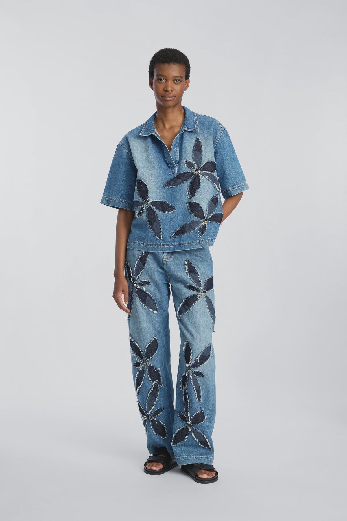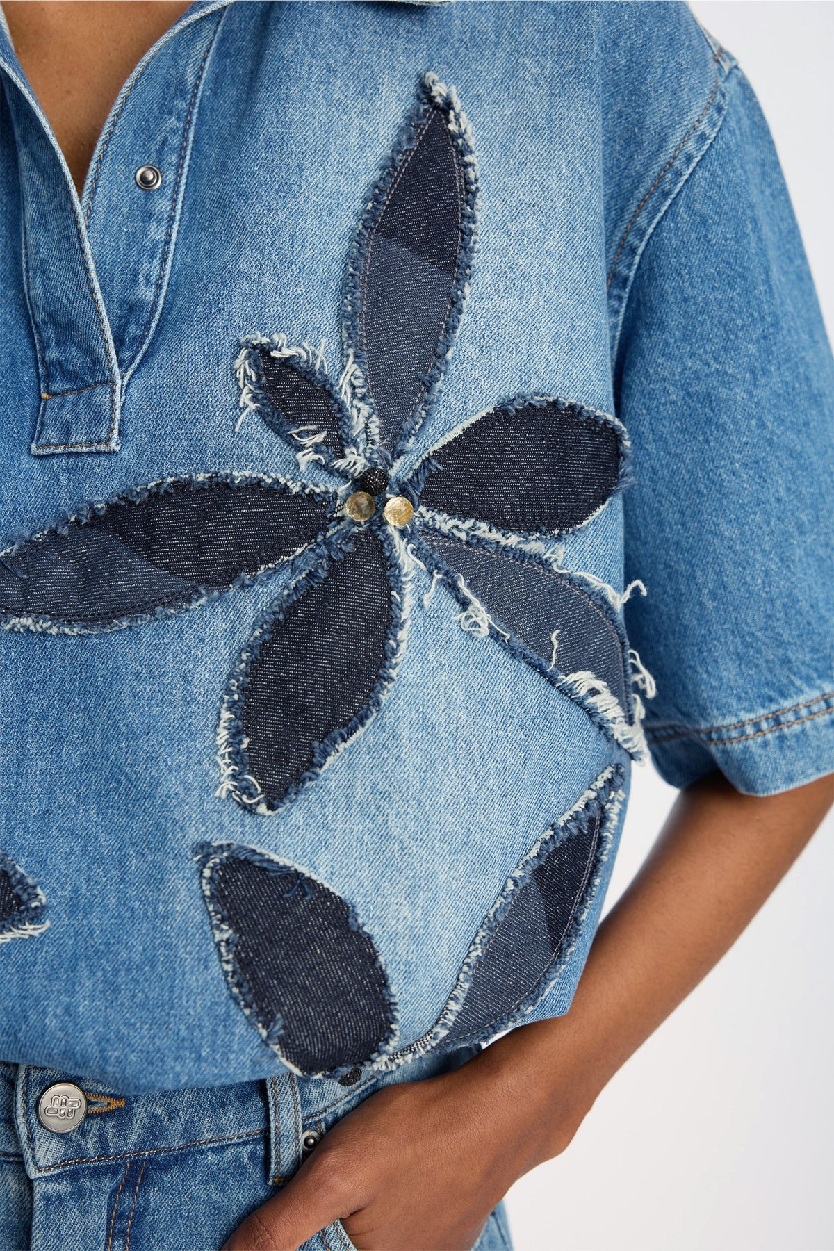 Top in denim with floral applique details created in a darker denim. The top has short sleeves, a collar, and a loose fit.