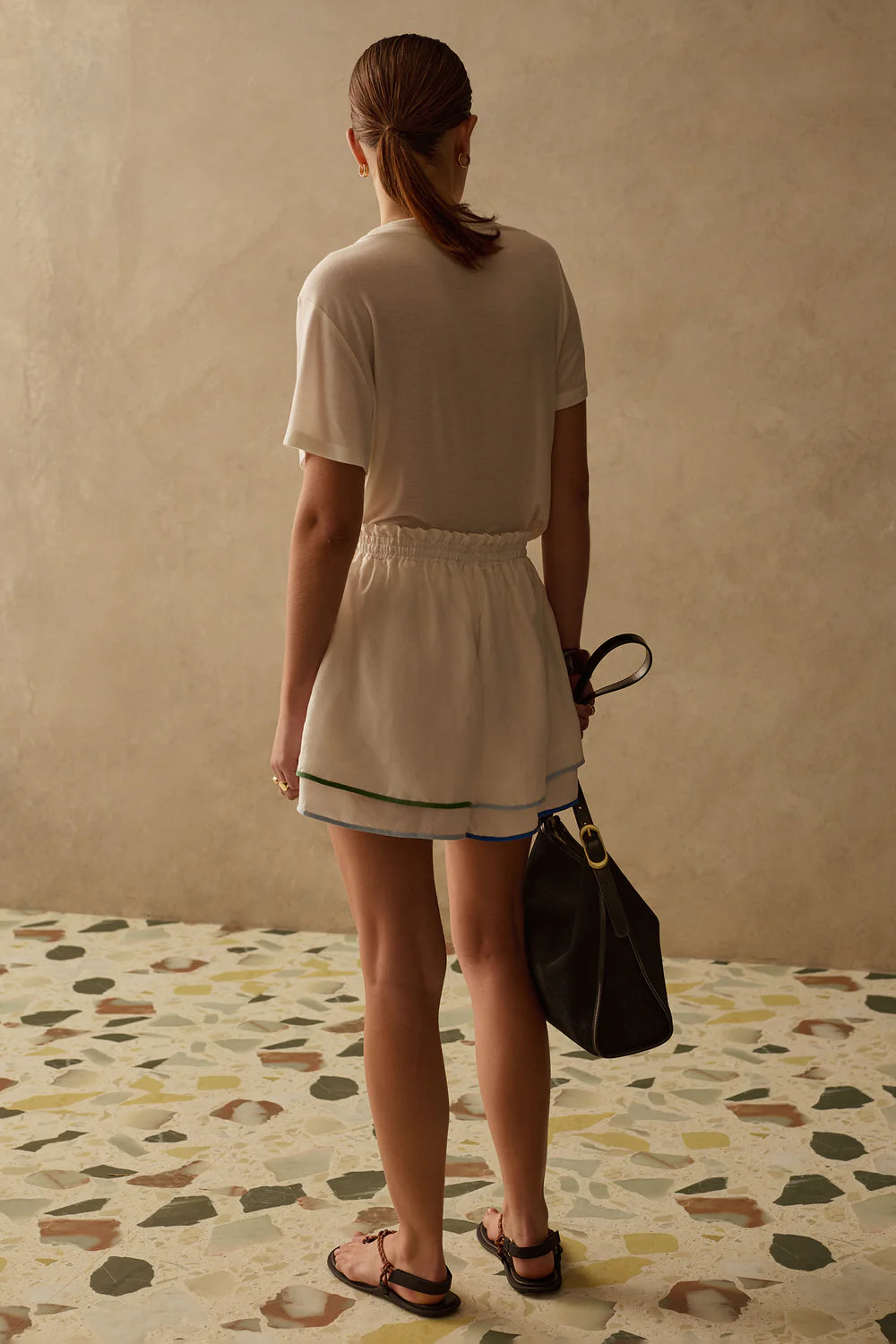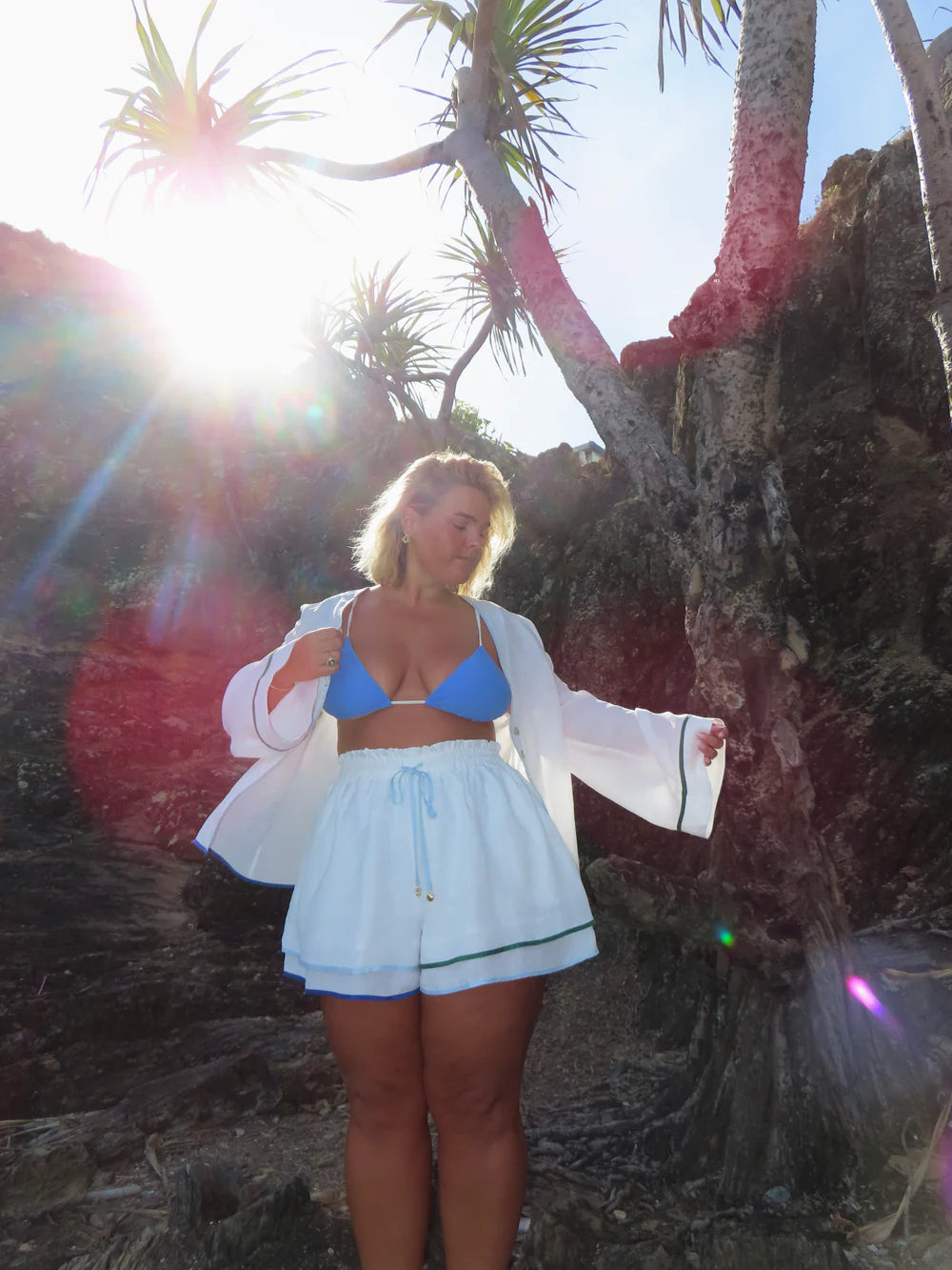 A chic option for warm weather, the Asha Shorts are light and breezy. The floaty, double layered hem adds a hint of femininity. Emphasise the a-line silhouette by cinching the ties adorned with beautiful gold shell beading.